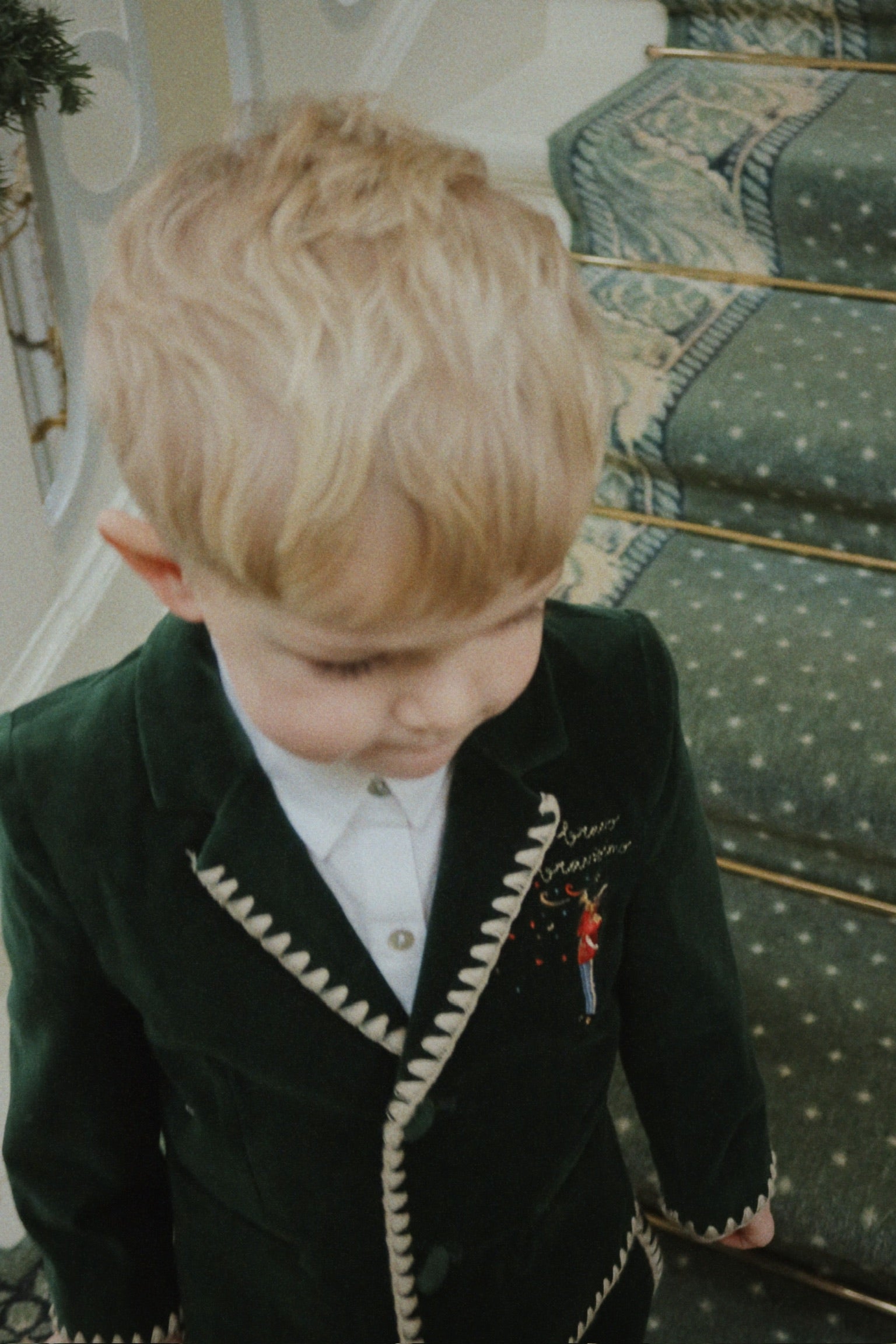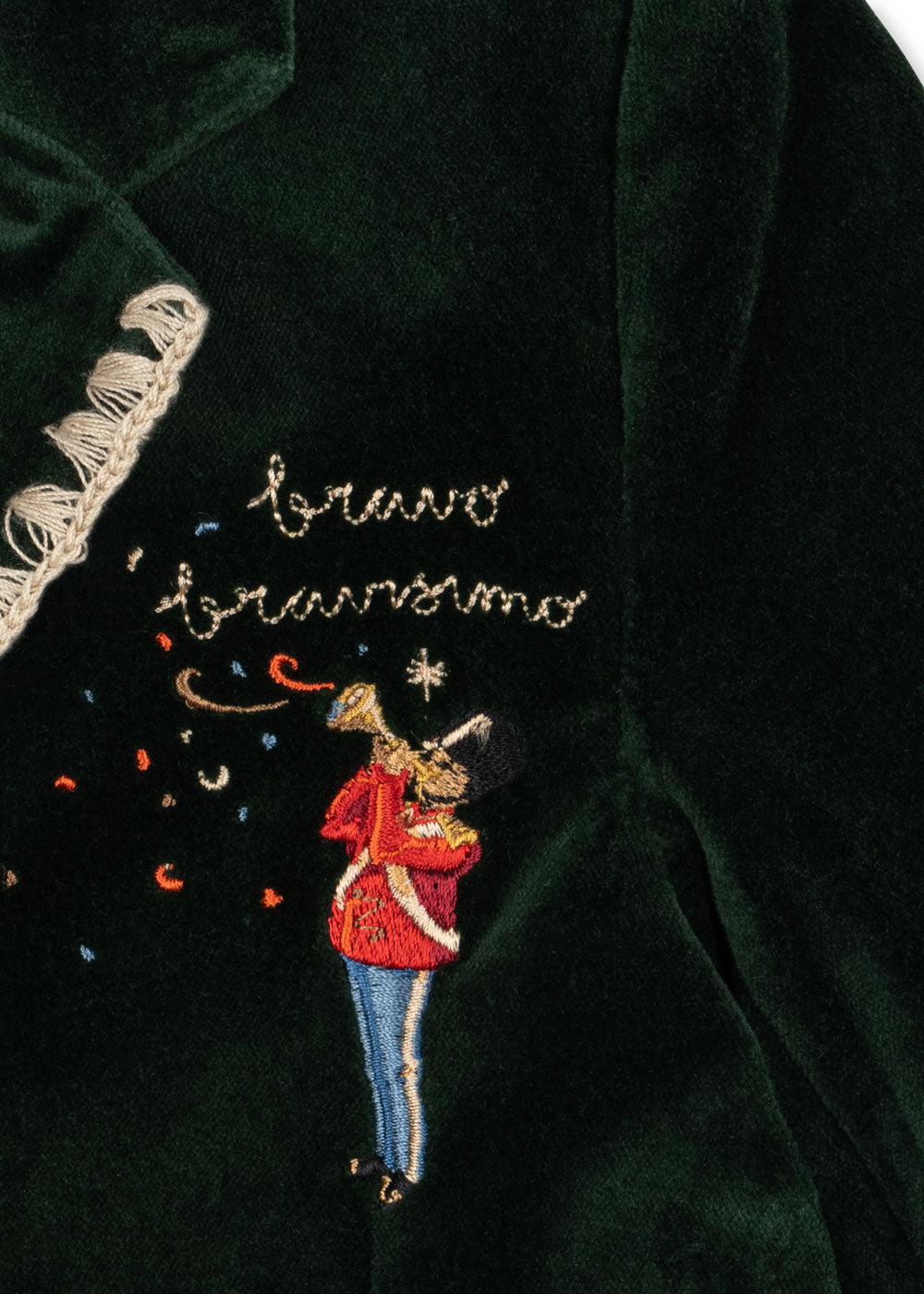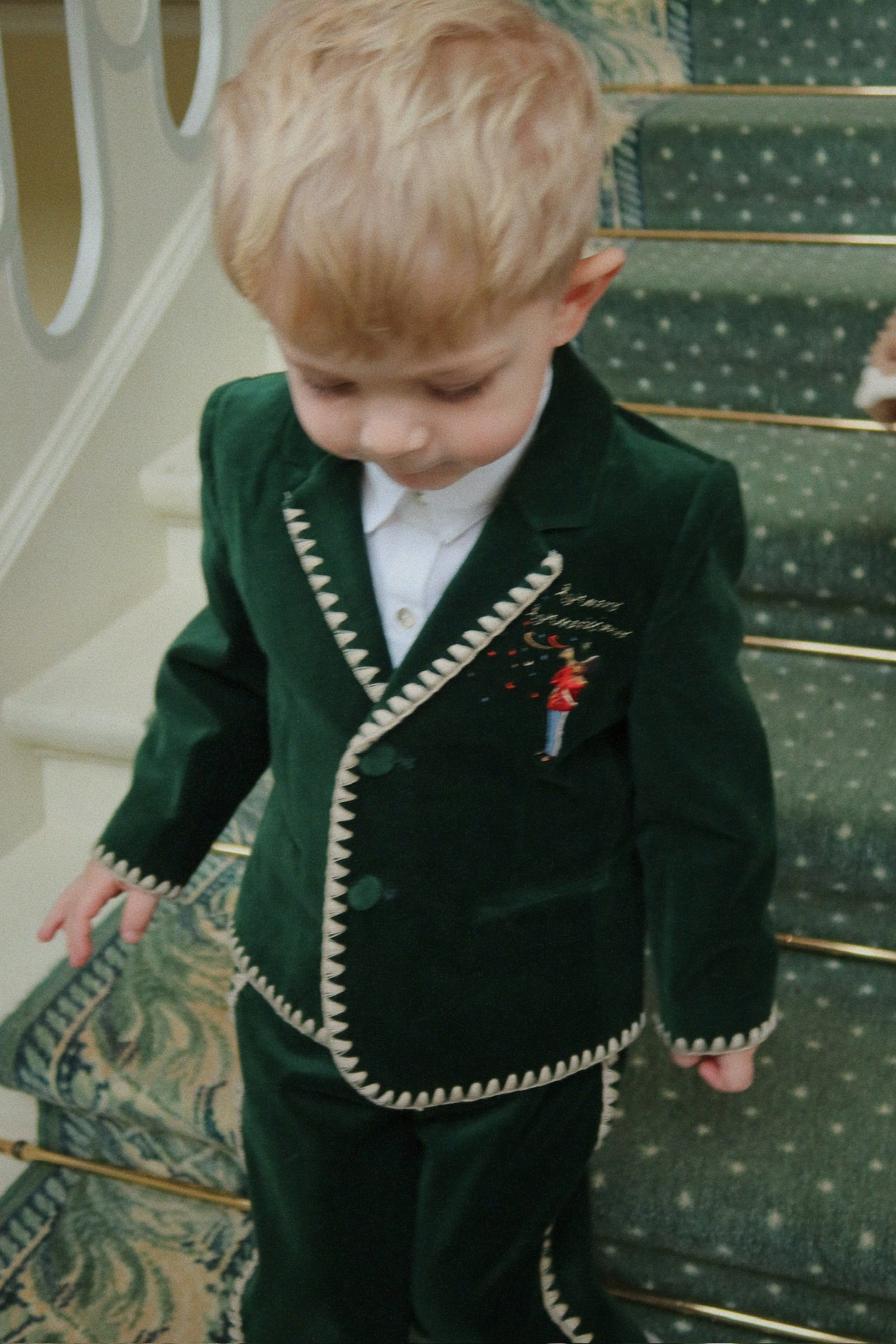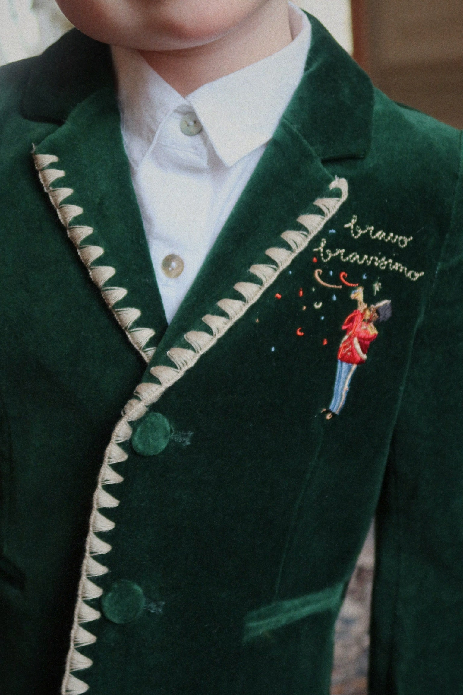 Soft velvet blazer with timeless detailing. Features classic lapels, button closure, welt pockets, and decorative white contrast stitching.